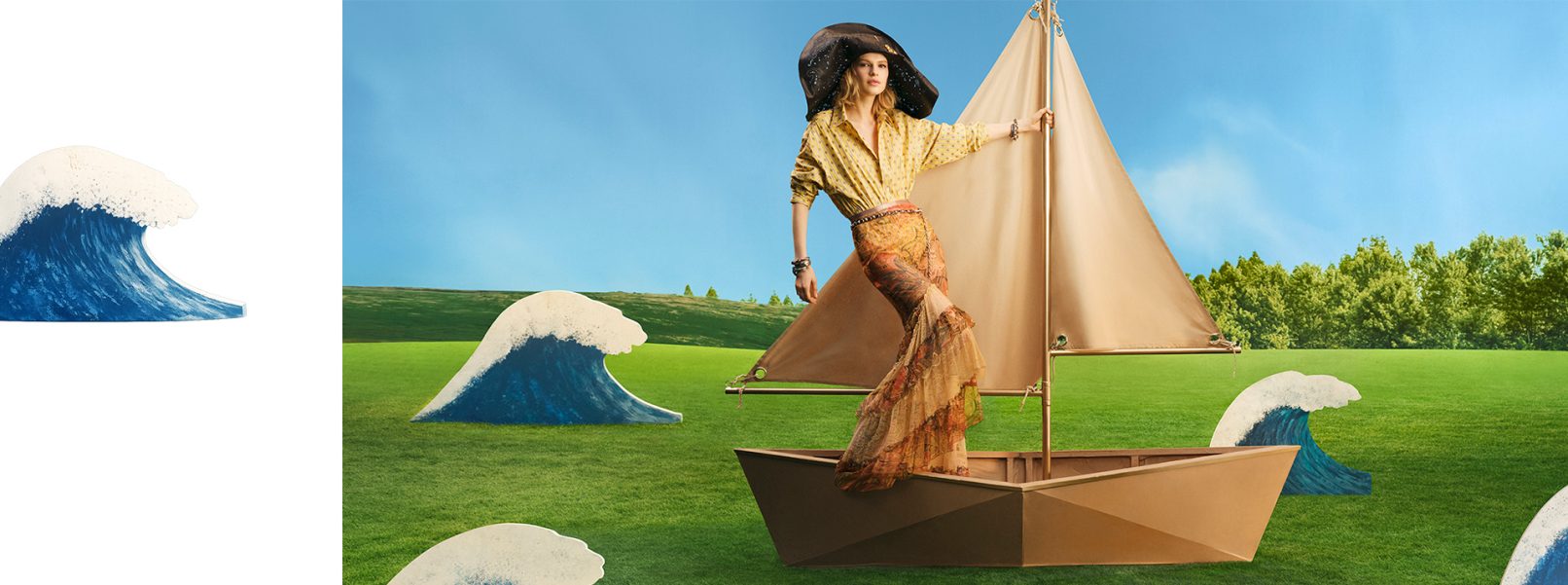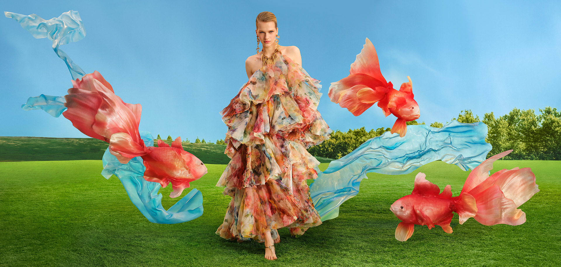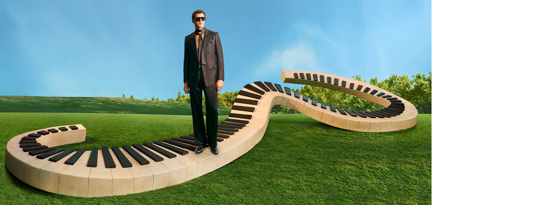 Rather than functioning as a mere backdrop, the set is conceived as an integrated environment that establishes a dialogue with the silhouettes of the collection, positioning fashion within a theatrical framework. While evoking an open-air atmosphere, the composition maintains a strong sense of stage aesthetics. Elements such as flying fish, a monumental curved piano, clouds, sun, a grass landscape, and a theatrical curtain are orchestrated to form a controlled surreal setting — a stage where reality and fiction intersect.