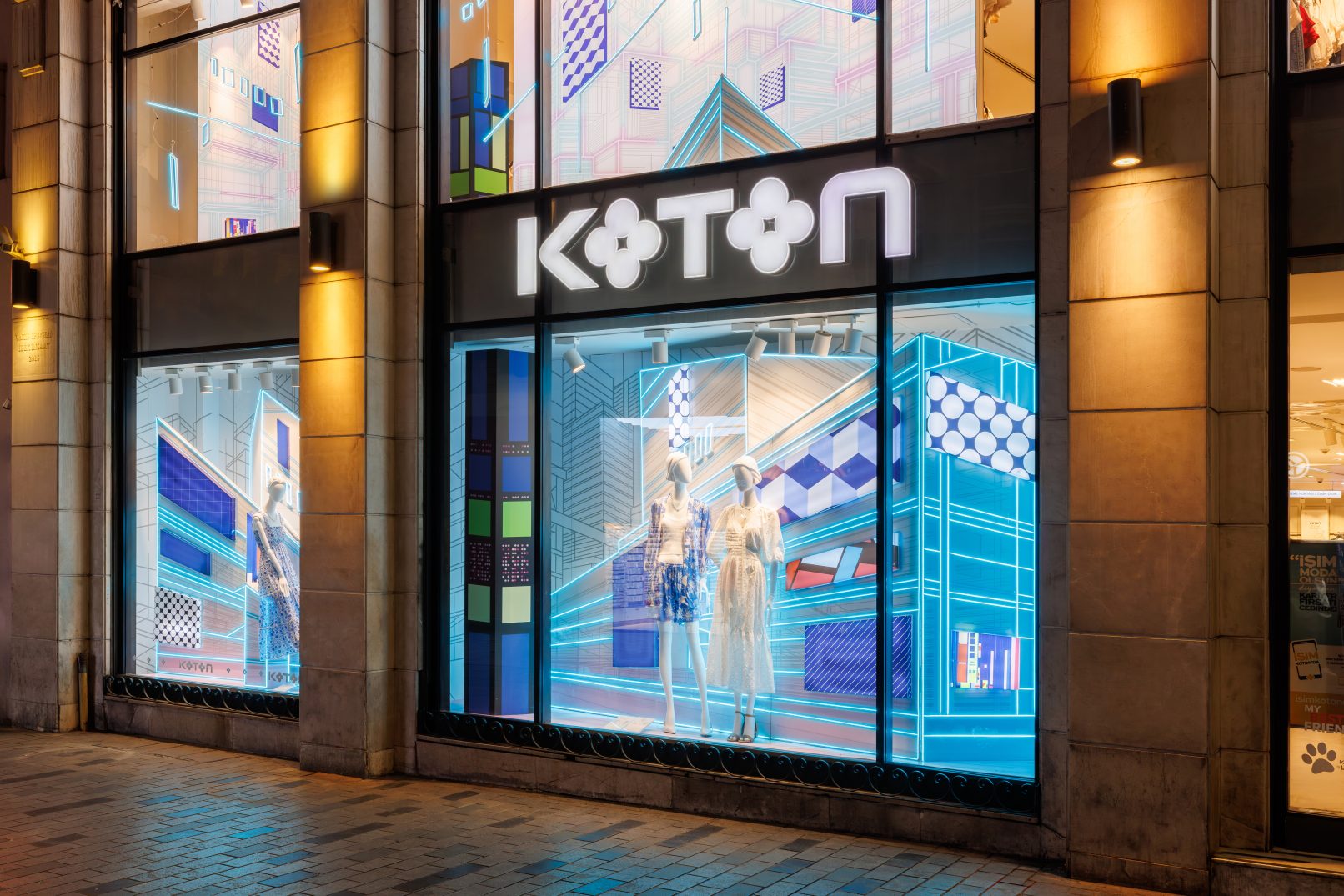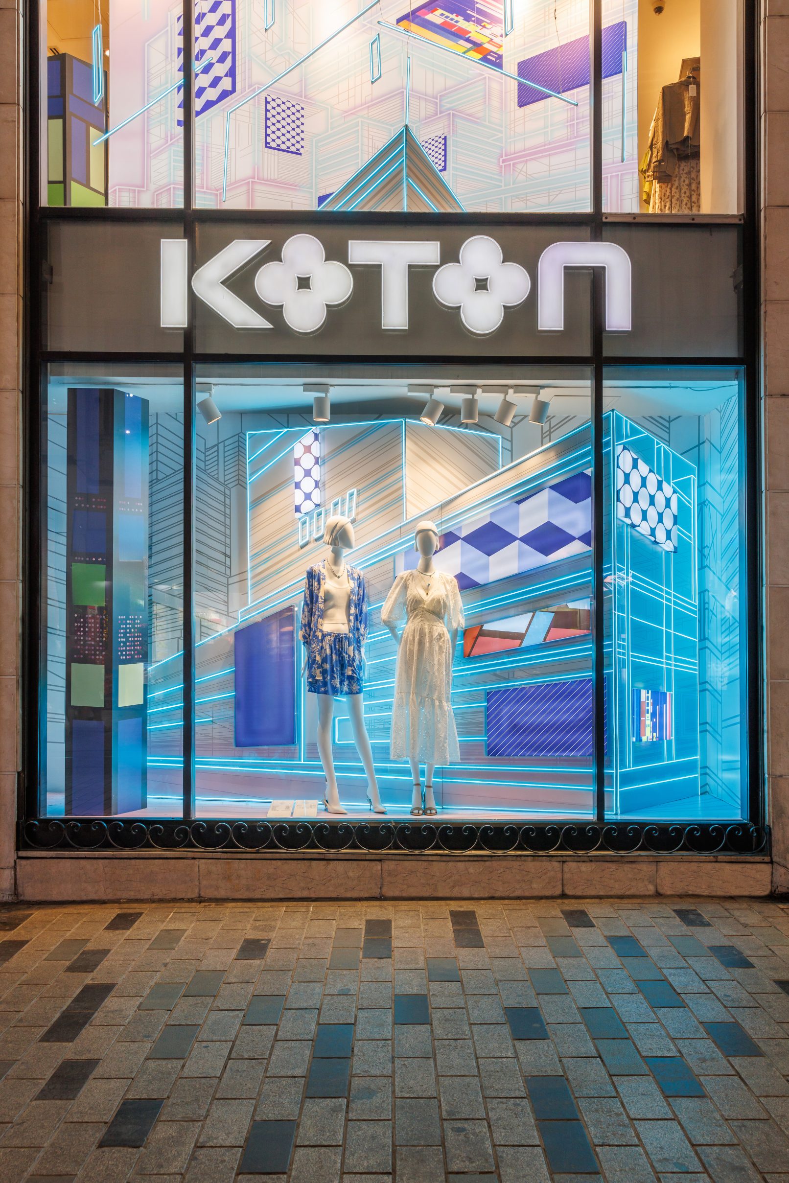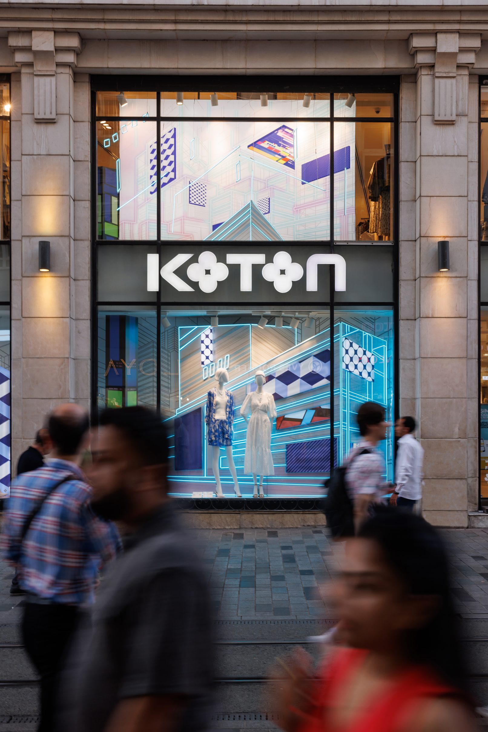 For Koton’s flagship store on İstiklal Street, I aimed to create a window design that reflects the brand’s urban, bold, and trend-setting identity. In our first collaboration for the Summer 2024 season, I envisioned a contemporary concept infused with the spirit of both the present and the future, brought to life through vibrant neon lights.