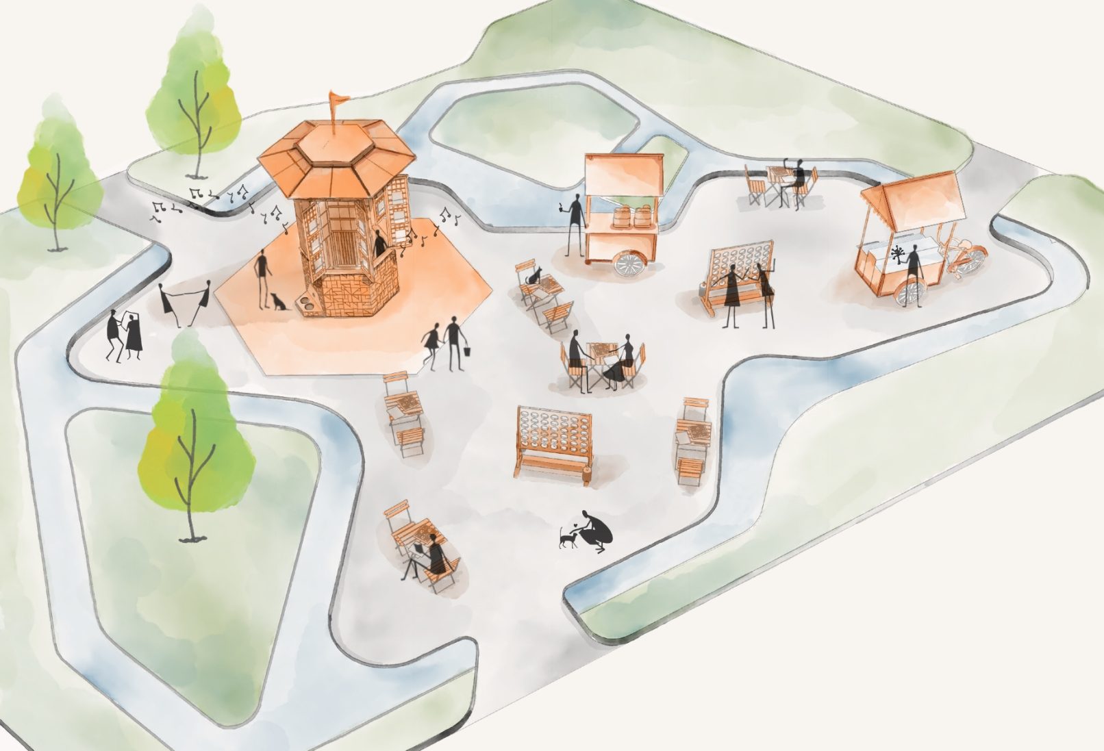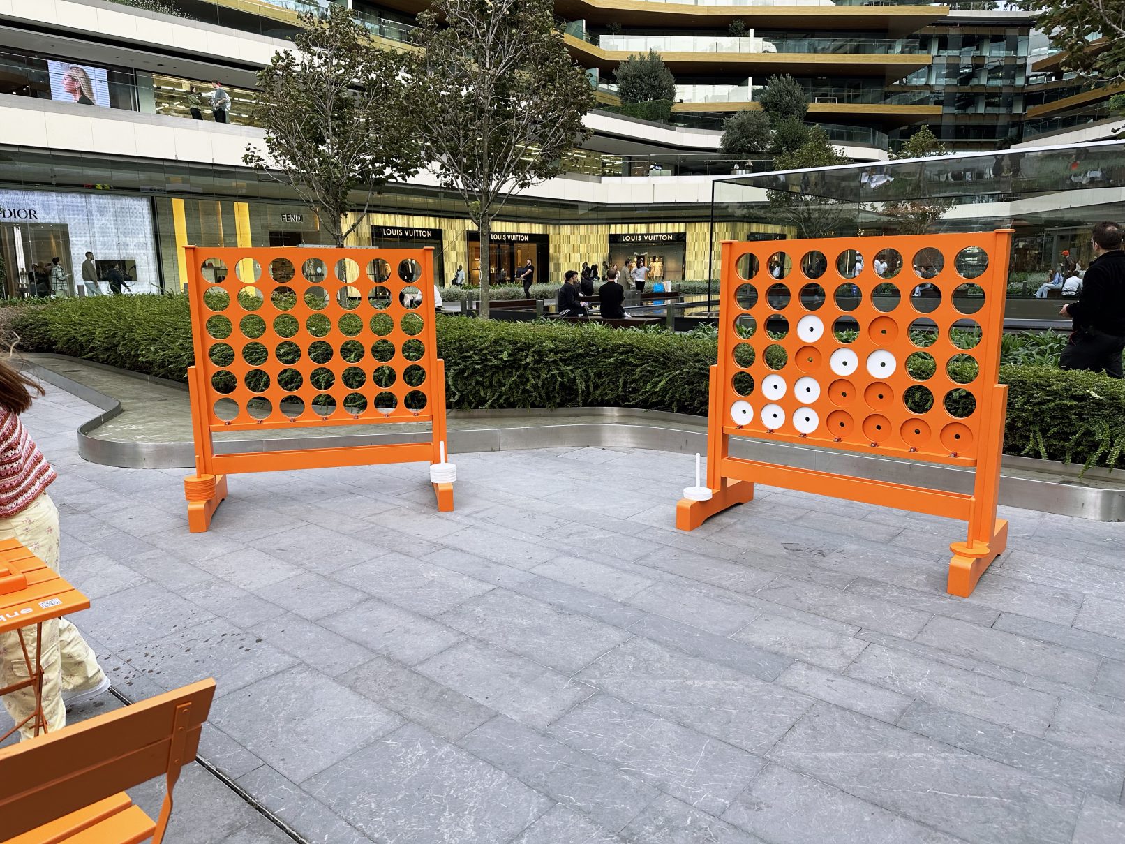 The pattern on the kiosk was also applied to the food and water stand designed for dogs and placed in the area. Giant games and tabletop games were crafted to form a playable aesthetic with each piece.
