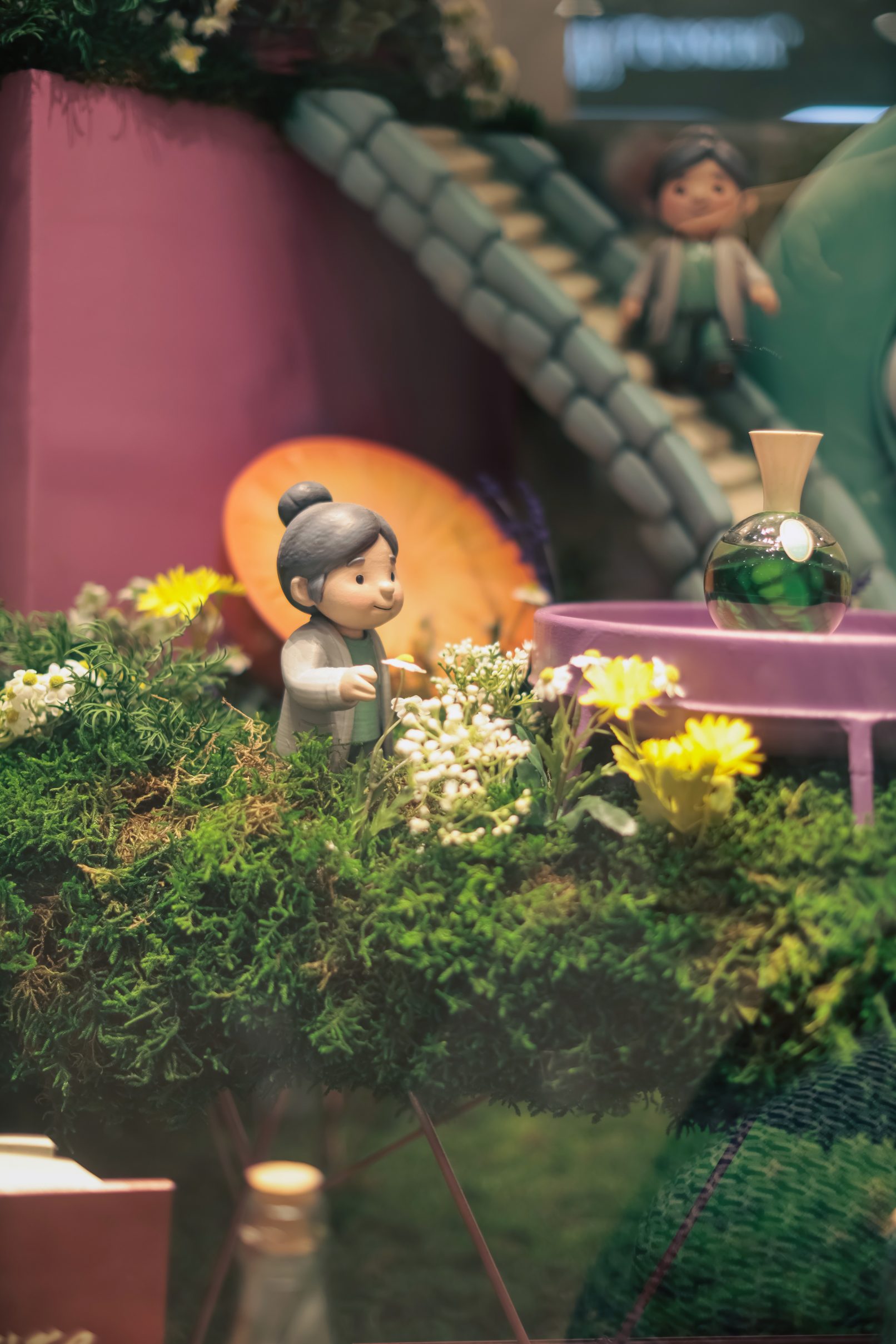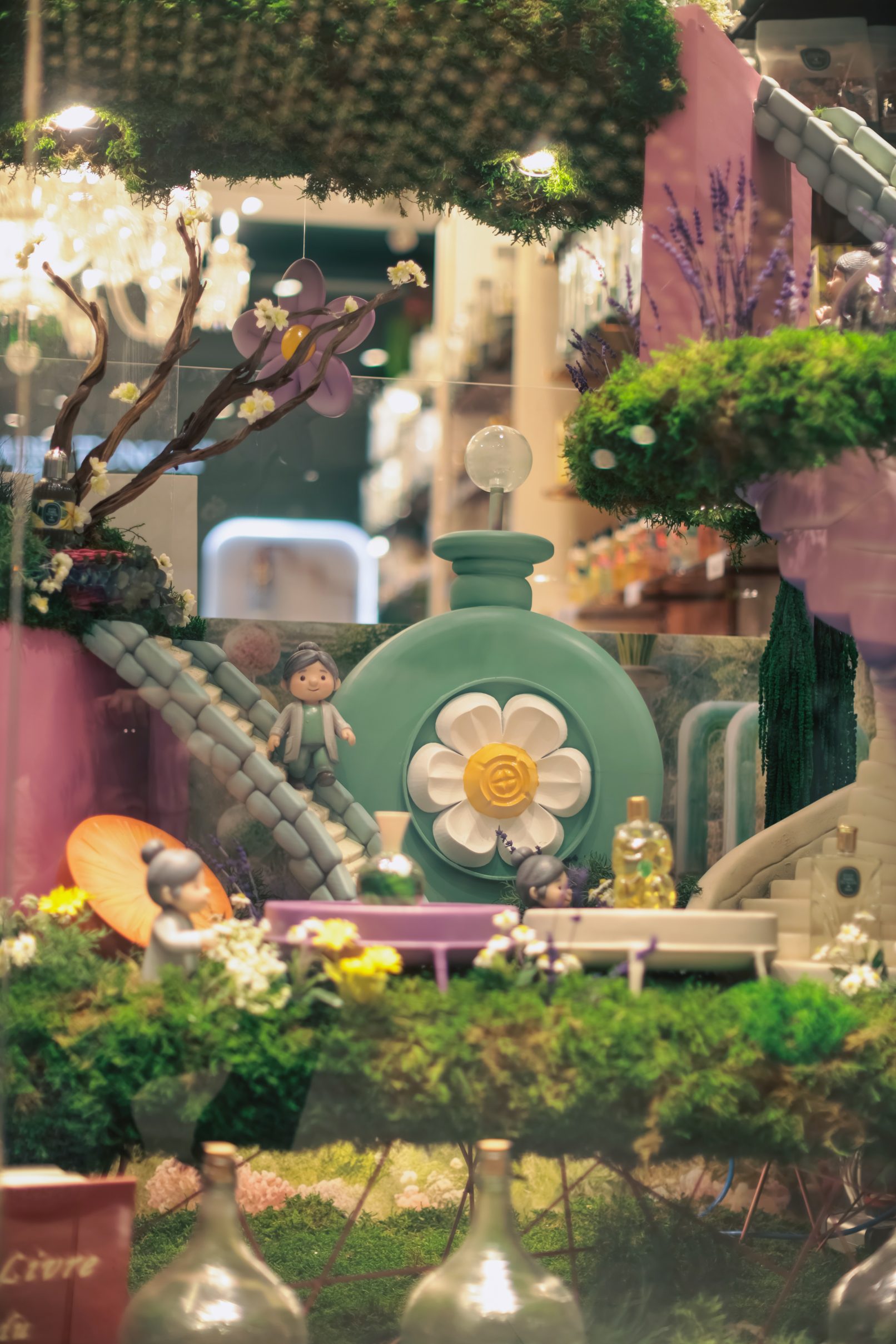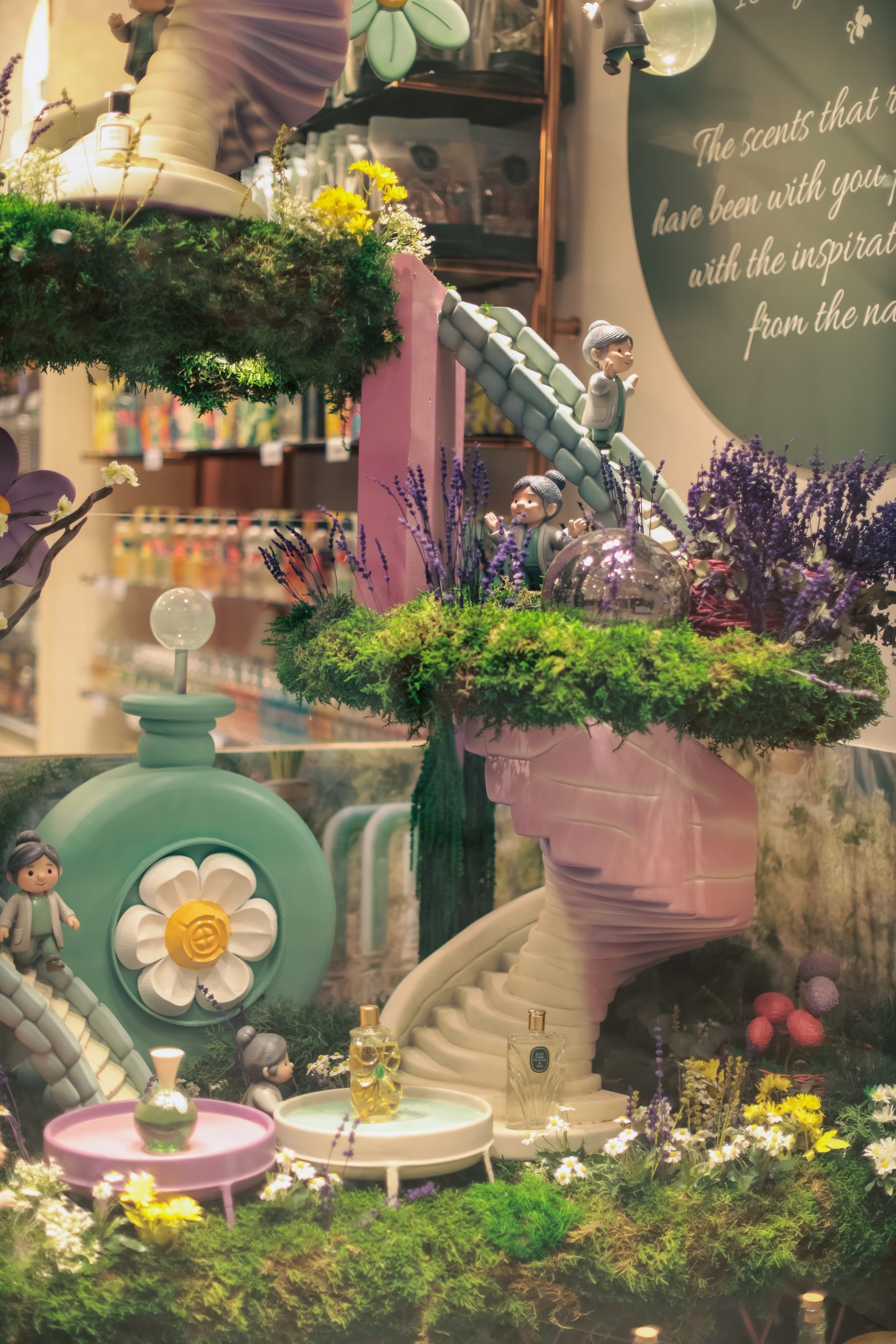 Conceived as a “fairytale of production,” the window presents a layered narrative that draws the viewer in. The journey begins with flowers and tubes hanging from the top and continues through a playful production line operated by miniature characters. These characters carry plant extracts, mold soaps, and fill colognes. With essences spiraling down staircases, oversized flower caps, and pastel-toned details, the design creates an atmosphere that feels both technological and organic.