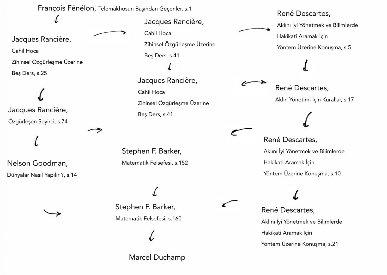 Sergen Şehitoğlu’nun mekana özgü yerleştirmesi, mümkün olan en arındırılmış haliyle pedagoji, insan öğrenmesi ve zihinsel özgürleşme üzerine bir düşüncenin mekansal ifadesidir. Arka plan olarak aldığı, 19. yüzyılın eşitlikçi pedagogu Joseph Jacotot’yu, “Cahil Hoca”nın yazarı Jacques Rancière’e bağlayan, Fénelon ve Telemachus’un yanından geçerek, satranç oyuncusu Marcel Duchamp’a ve matematikçi, filozof ve metafizikçi René Descartes’a doğru dallanan bir referanslar ağını etkinleştirir.